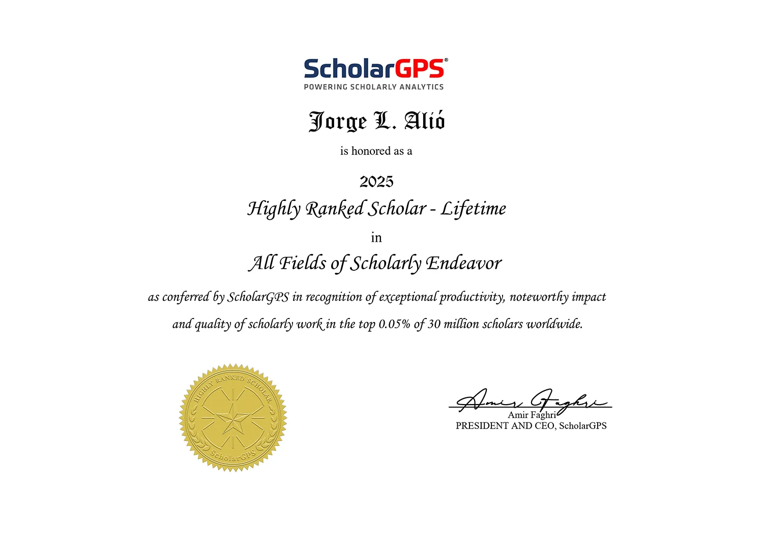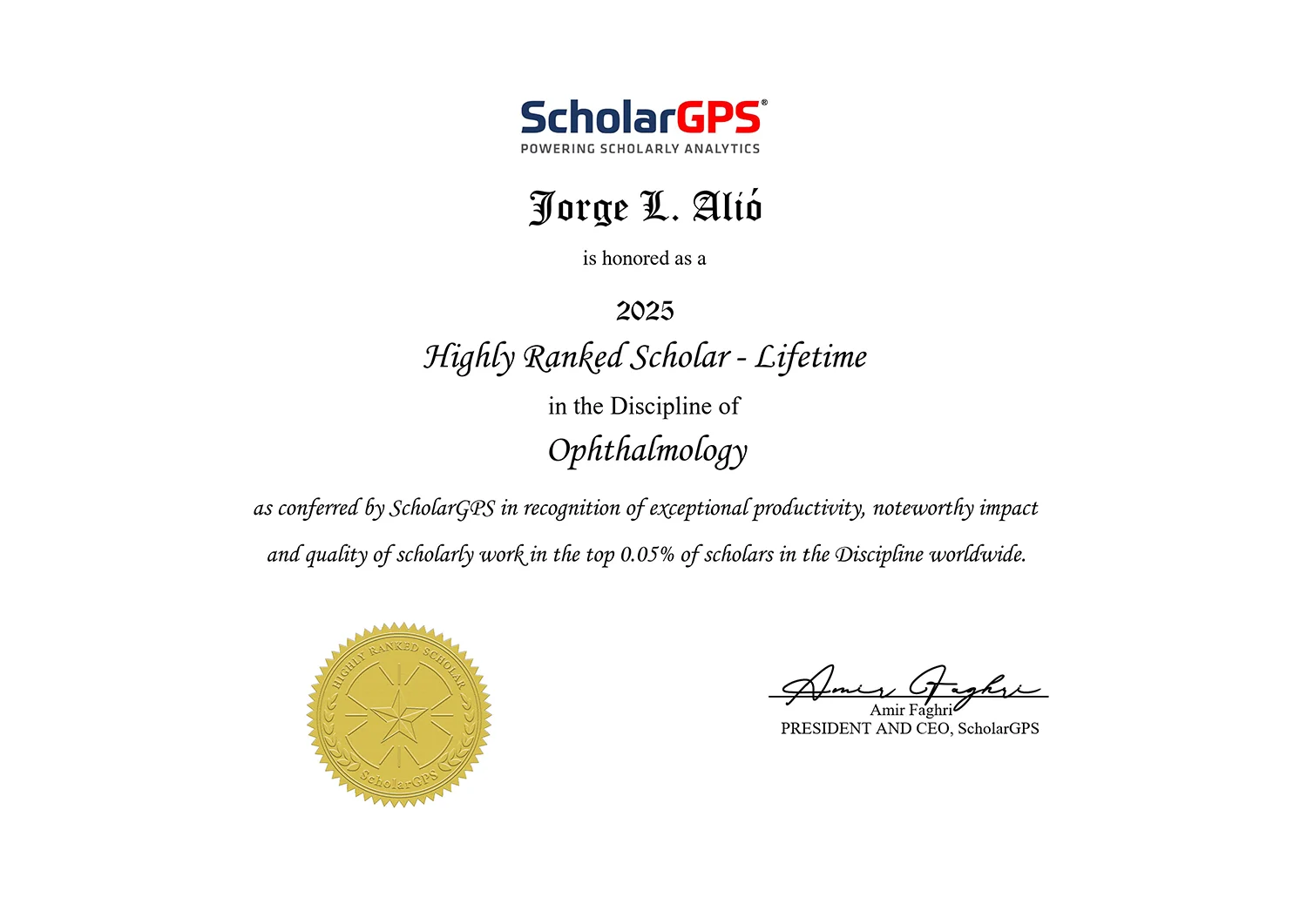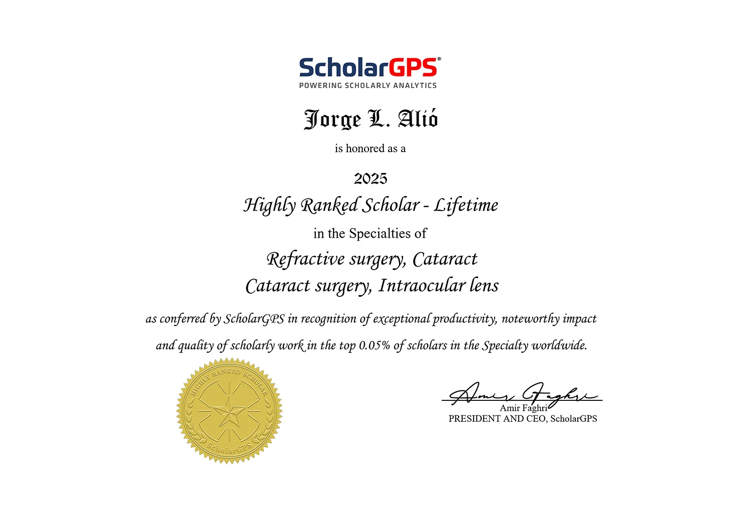El profesor Jorge Alió es un destacado cirujano oftalmólogo español que se dedica a actividades quirúrgicas del segmento anterior del ojo a la investigación clínica y actividades humanitarias dentro de una Fundación creada con su nombre. Ha sido reconocido entre los 100 primeros profesionales más influyentes en la oftalmología del mundo y entre los primeros 1000 científicos del mundo. Su perfil científico indica su índice H 60, que indica la frecuencia con la que sus trabajos científicos se refieren por otros, de los más altos de España y de Europa en su especialidad.